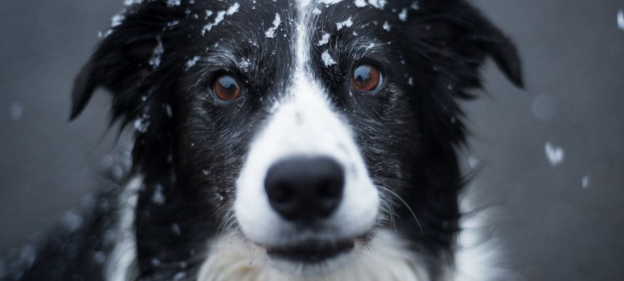 Collie dog with snowflakes on face