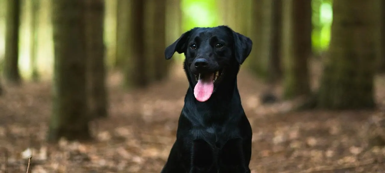 Black dog sat in woodland