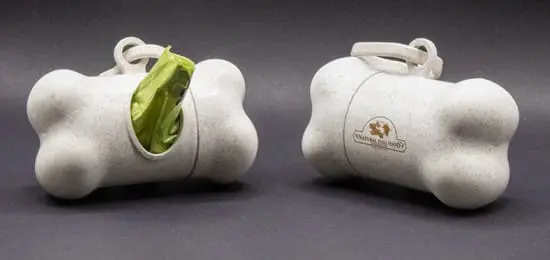 This waste bag dispenser made from eco-friendly plant materials and shaped like a bone, 15 biodegradable waste bags included.