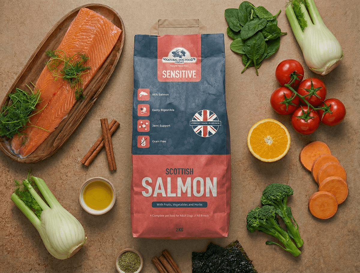 Introducing our Natural Dog Food Company Sensitive Scottish Salmon – expertly crafted for dogs with sensitive digestion, available in convenient 2kg, 6kg, and 12kg options. Specifically designed for gentle nourishment, this grain-free recipe provides complete, balanced nutrition tailored to delicate dietary needs.