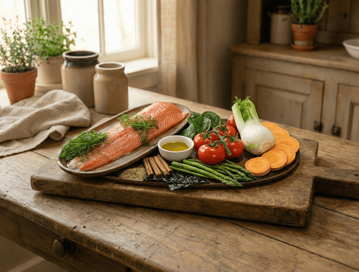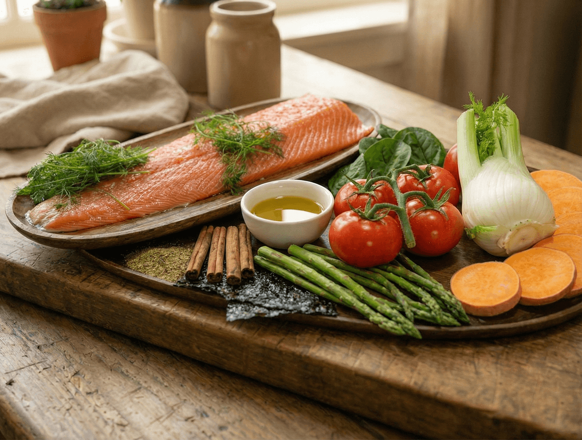 65% Fish (Freshly Prepared Scottish Salmon (35%), Dried Salmon (23%), Salmon Oil (4%), Salmon Stock (3%)), Sweet Potato, Beans, Beet Pulp, Fruits Vegetables & Herbs (Dill, Spinach, Fennel, Asparagus, Tomato)*, Omega 3 Supplement, Minerals, Fructooligosaccharides (175mg/kg) Mannanoligosaccharides (50mg/kg), Olive Extract (0.01%)